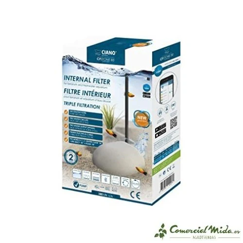 Ciano Filtro CF Stone es un sistema de alto rendimiento de filtrado interior para la limpieza y tratamiento con triple proceso de purificación (químico, biológico y mecánico) del agua de acuarios y tortugueras. Su peculiar forma y diseño de piedra hace que se camufle con el entorno, permitiendo llevar a cambio su función de eliminación, limpieza y colonización de bacterias mediante sus dos circuitos de agua independientes sin detectar su presencia. Dispone de la aplicación My Ciano, que permite el seguimiento del estado del agua en tiempo real, creando alertas para la renovación y revisión de los acuarios y tortugueras. Este filtro interior está disponible en dos formatos: para acuarios de capacidad de hasta 40 litros y de hasta 80 litros.